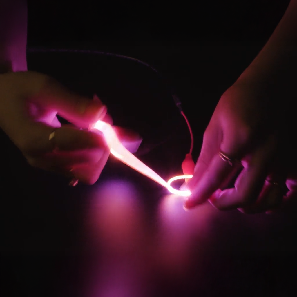 Each nOOd consists of dozens of tiny LEDs bonded to a flexible metal strip and coated in soft silicone for durability and a smooth glow. Simply connect 3V across the ends to bring it to life. For best results, use a current-limiting resistor (recommended max 50mA) to protect the LEDs and ensure long-lasting performance.