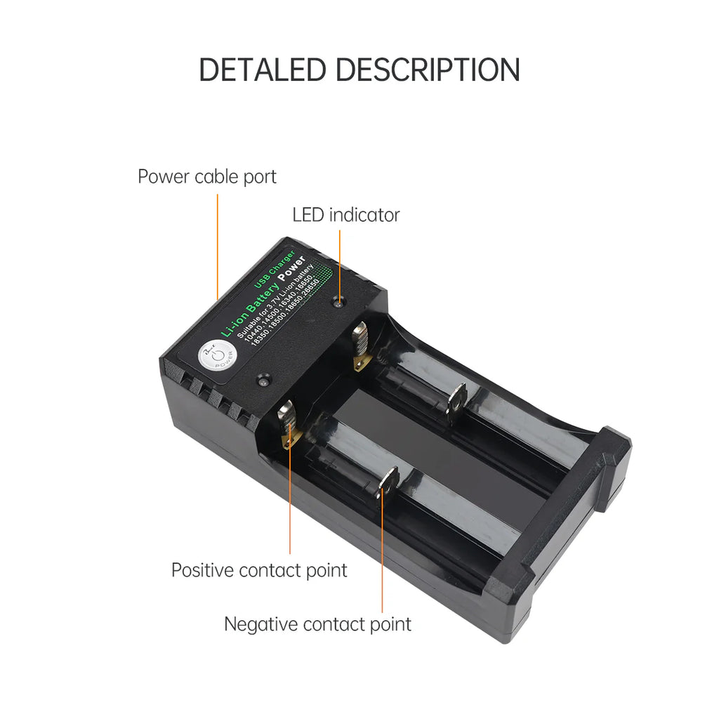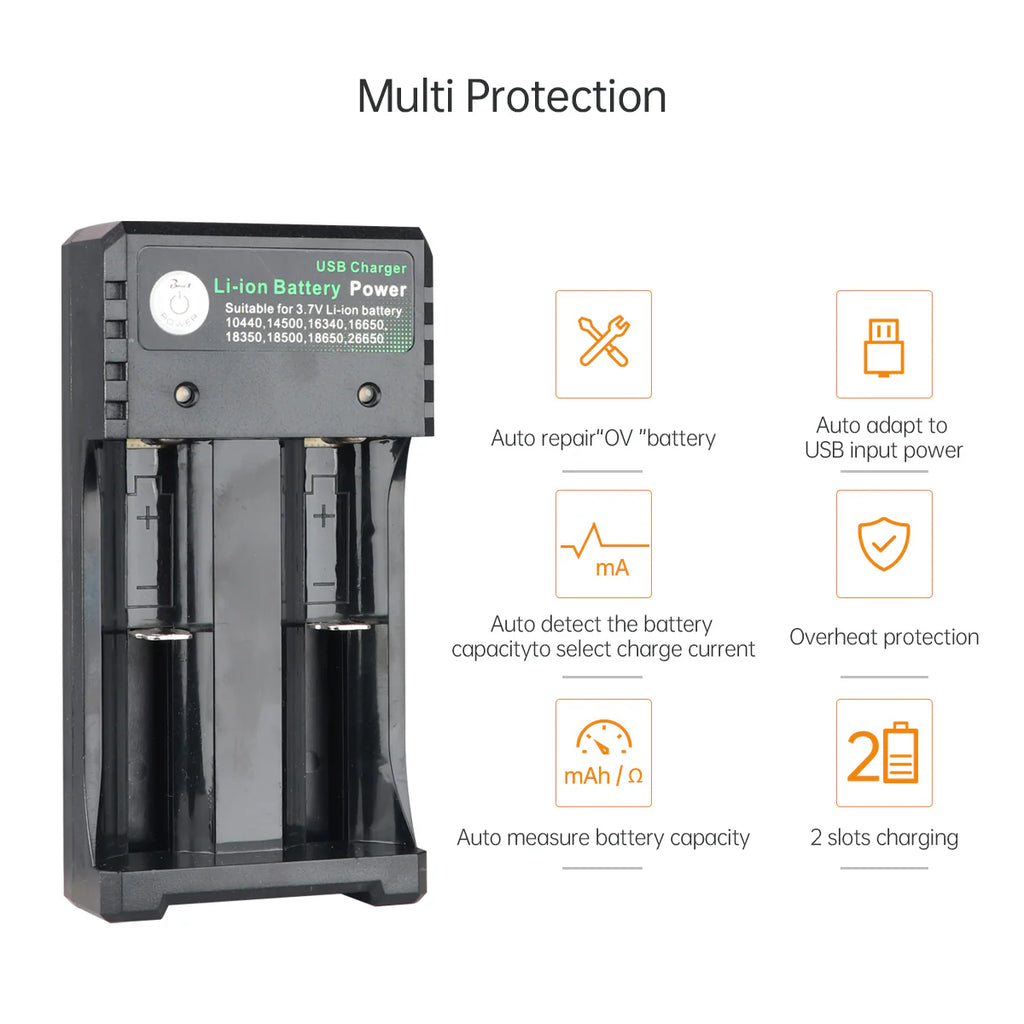 Intelligent Universal 18650 Battery Charger has two independent charging channels. Smart Speedy Battery Charger with USB Port for 3.7V Li-ion Rechargeable Battery can stop charging automatically when the capacity is full. Suitable with 3.7V lithium batteries 10440, 14500, 16340, 16650, 18350, 18500, 18650, 26650