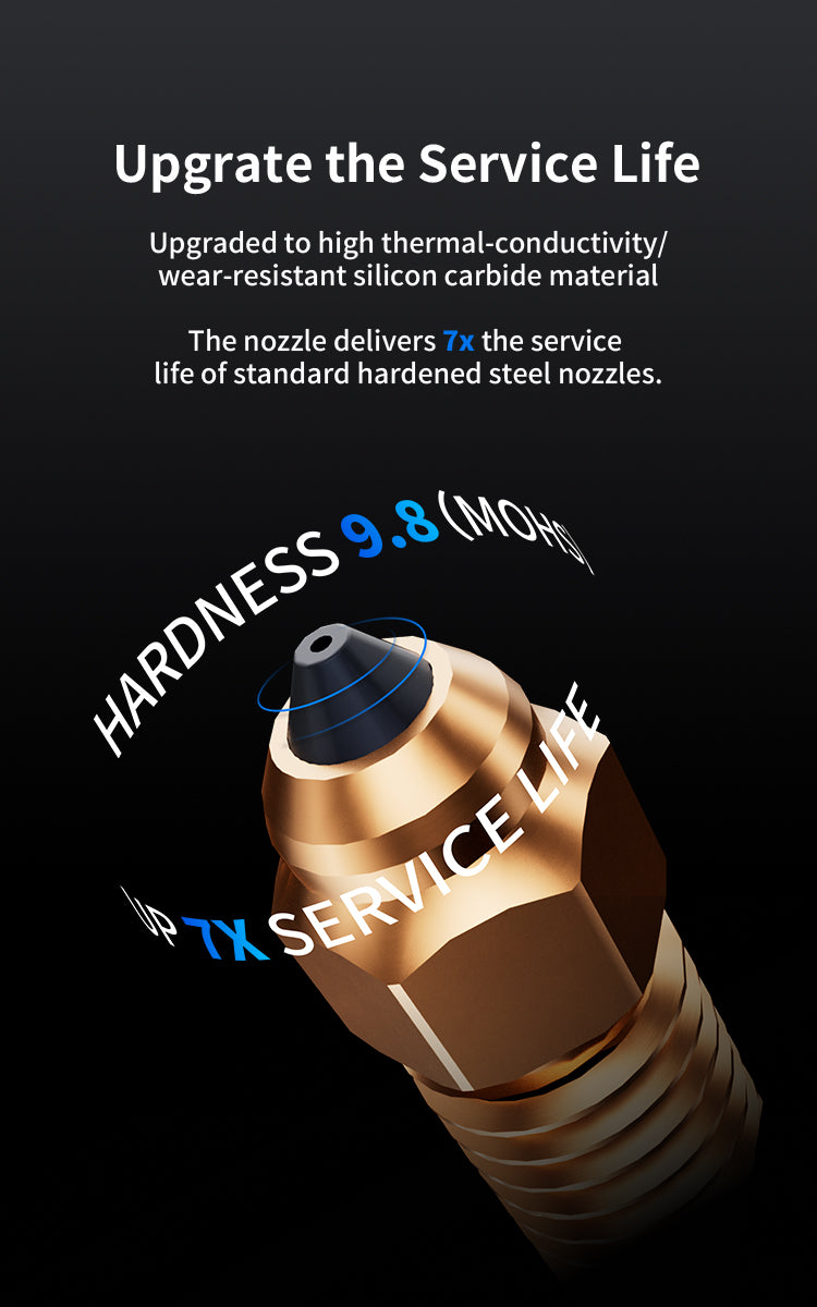 - Advanced Silicon Carbide Material: Provides extreme hardness and wear resistance, extending nozzle lifespan even with abrasive filaments.